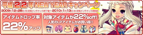 本日12月28日(月)メンテナンス終了時から2010年1月13日(水)定期メンテナンス開始前まで、来年の平成22年にちなんだ「NEW YEAR キャンペーン」を実施します!